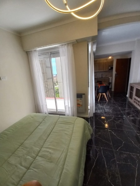Amplio departamento de un ambiente lateral con balcon con piso de cerámicos. Cocina incorporada con heladera. Cocina , lavarropas y microondas nuevos a estrenar