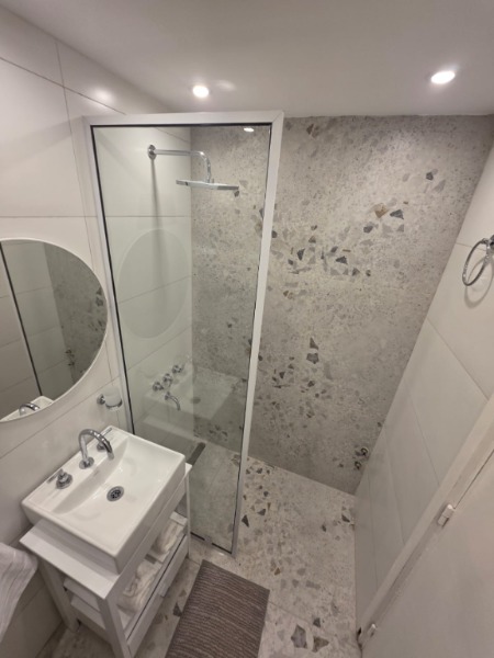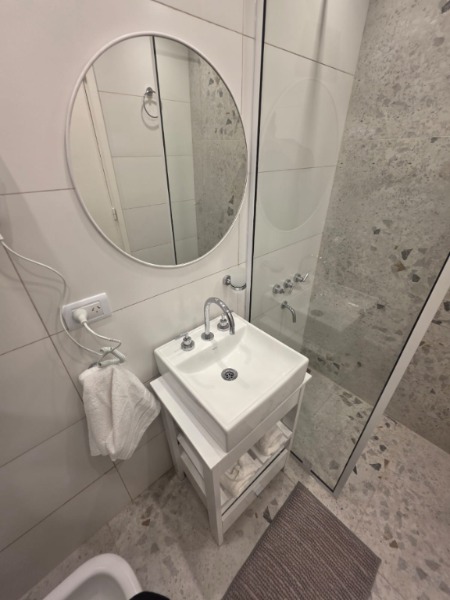 Baño completo con mampara, inodoro y bidet Ferrum línea Bari, vanitory madera blanca laqueado, griferia Piaza, secador de pelo (tipo hotel) y todo el equipamiento de baño.